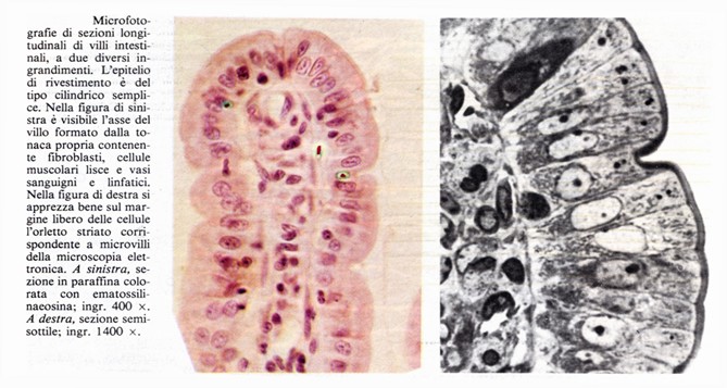 Quello ciliato si trova nella mucosa dell’ovidotto, dei piccoli bronchi e in aree circoscritte dell’utero. Quello non ciliato ha funzione assorbente e si trova nello stomaco, nei dotti escretori delle ghiandole e nell’intestino tenue. L’intestino tenue completa la digestione dei cibi e permette ai prodotti finali della digestione di passare selettivamente nei vasi sanguigni e linfatici. Per fare questo l’epitelio intestinale ha una particolare struttura e le sue cellule presentano una loro proprietà chiamata polarità.