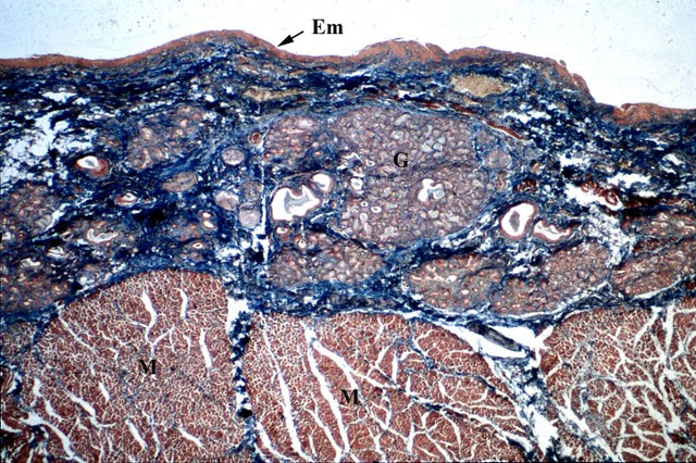 Le ghiandole labiali (G) sono accolte, invece, in uno strato connettivale lasso più profondo. Sono ghiandole tubulo-acinose ramificate a secrezione mista e possono a volte spingersi fino allo strato muscolare (M).