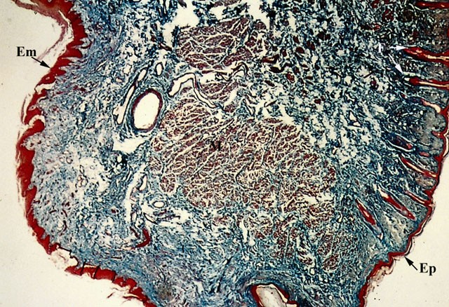 La cute è formata da epidermide e derma. L’epidermide (Ep) è formata da un epitelio pavimentoso pluristratificato, mentre il derma è ricchissimo di fibre elastiche.